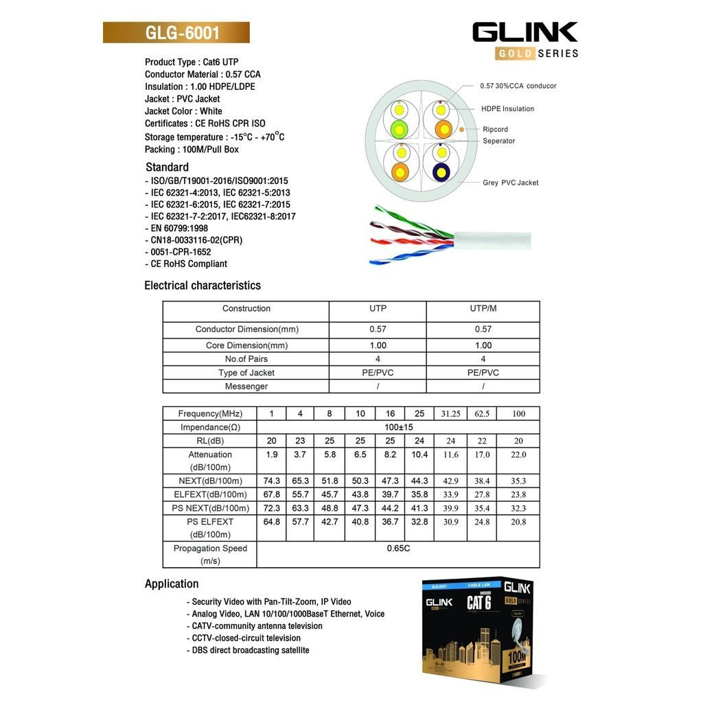 Glink Gold Series CAT6 UTP CABLE (100m/Box) สำหรับใช้ภายใน รุ่น GLG6001 (GLG-6001)